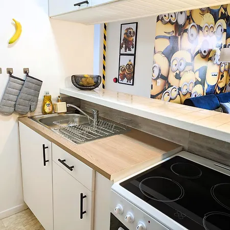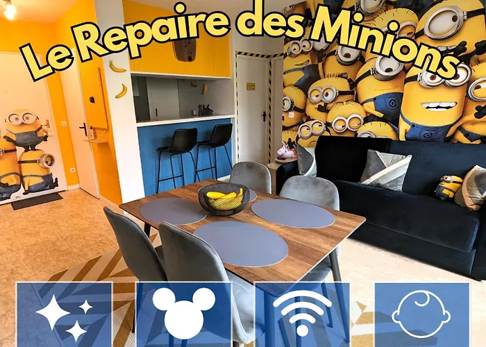 Das Le Repaire Des Minions - 10' Disney - Familial bietet seinen Gästen einen Balkon, die mit einem Sofa und modernen Annehmlichkeiten wie einem Flachbildfernseher mit Satellitenkanälen ausgestattet sind. Zu den Sicherheitseinrichtungen im Zimmer gehören Rauchmelder. Das Apartment umfasst 1 Schlafzimmer. Es gibt 1 Badezimmer mit einer getrennten Toilette und einer Badewanne sowie einem Haartrockner und Badelaken.